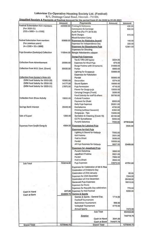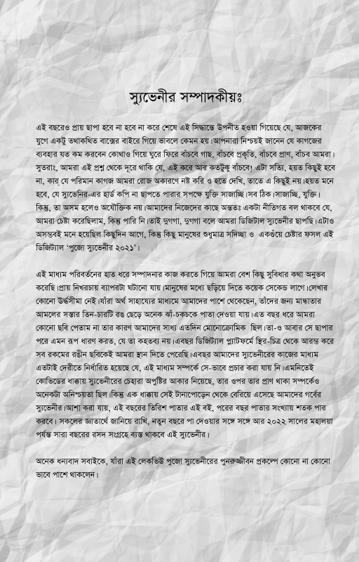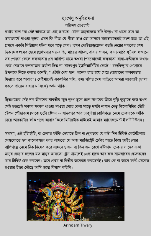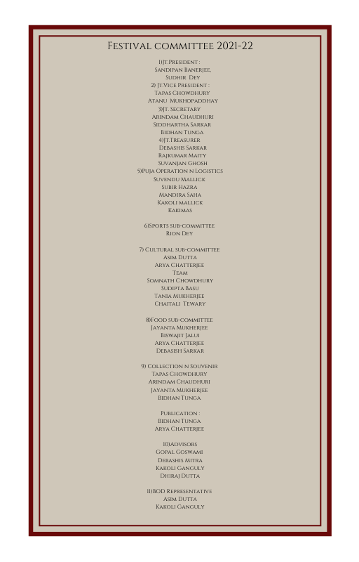 The inauguration is on Sharad Panchami (5th day) fixtured with food festival by the resident ladies of the society, followed by the recipe content, felicitation of 10th and 12th standard passed students of the society and finally a musical extravaganza by external artiste. The Sharad Sasthi (6th day) is featured with cultural program pivotal of the theme of harbinger of the arrival of Goddess. The Sharad Saptami (7th day) is completely dedicated to theatrical performances of in-house residents. The Sharad Astami (8th day) and Sharad Nabami (9th day) is exclusively locked in by miscellaneous vocal, instrumental performances by in-house talents.