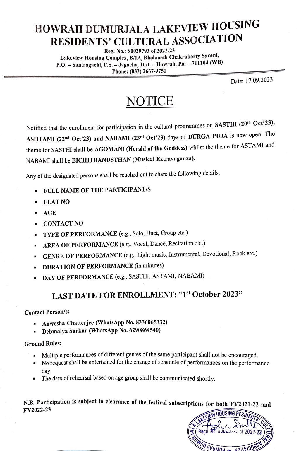 The inauguration is on Sharad Panchami (5th day) fixtured with food festival by the resident ladies of the society, followed by the recipe content, felicitation of 10th and 12th standard passed students of the society and finally a musical extravaganza by external artiste. The Sharad Sasthi (6th day) is featured with cultural program pivotal of the theme of harbinger of the arrival of Goddess. The Sharad Saptami (7th day) is completely dedicated to theatrical performances of in-house residents. The Sharad Astami (8th day) and Sharad Nabami (9th day) is exclusively locked in by miscellaneous vocal, instrumental performances by in-house talents.